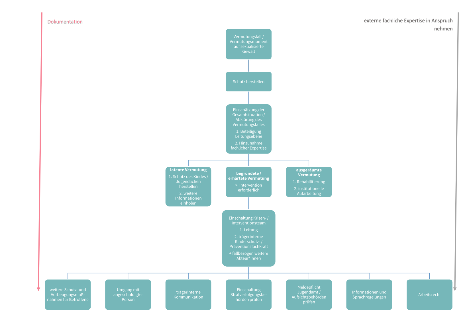 Für ein Rechte- und Schutzkonzept müssen daher verbindliche Verfahrensstandards im Umgang mit Vermutungen und für die Einleitung von Intervention entwickelt werden. So wirkt die Organisation einerseits „blindem Aktionismus“ und Überreaktionen entgegen und etabliert andererseits ein transparentes und faires Verfahren. Als konkreter Konzeptbaustein bietet sich ein Interventionsleitfaden an.