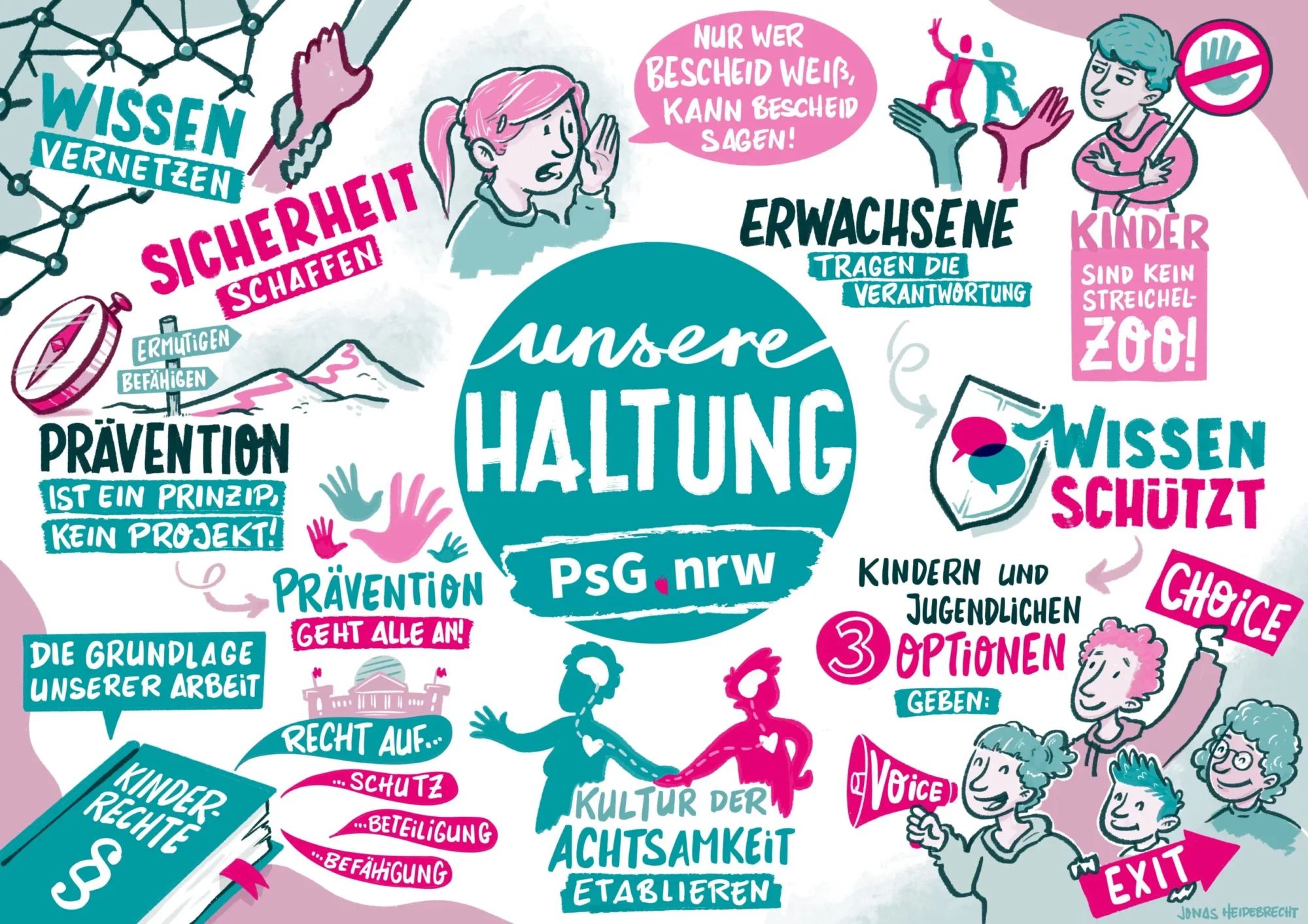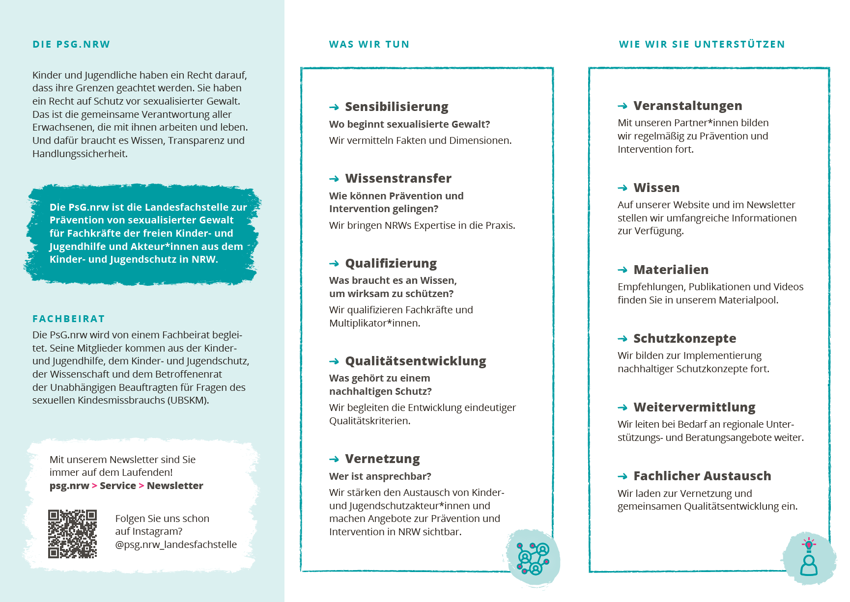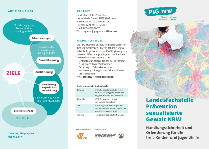 Der Schutz von Mädchen* und Jungen* obliegt uns Erwachsenen, die wir tagtäglich mit ihnen arbeiten bzw. leben. Eine einzige Person kann für ein von sexualisierter Gewalt betroffenes Kind oder einen Jugendlichen den Unterschied machen. Deswegen müssen alle Erwachsenen möglichst gut zum Thema Prävention von sexualisierter Gewalt informiert sein — getreu dem Motto der PsG.nrw: Wissen vernetzen. Sicherheit schaffen.